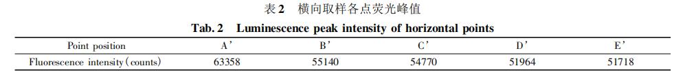 在量子點(diǎn)膜受疲勞載荷一側(cè)沿著裂紋邊緣依次取五個(gè)點(diǎn)A’、B’、C’、D’、E’,其中 A’點(diǎn)靠近裂紋初始位置,E’點(diǎn)靠近裂紋尖端,對(duì)其五個(gè)點(diǎn)進(jìn)行測(cè)試,各點(diǎn)光譜圖如圖 5,量子點(diǎn)熒光峰值如表 2,發(fā)現(xiàn)由裂紋初始位置向裂紋尖端熒光強(qiáng)度呈區(qū)域性增強(qiáng),五點(diǎn)之間峰值依次分別減少8218、370、2806 和 246。